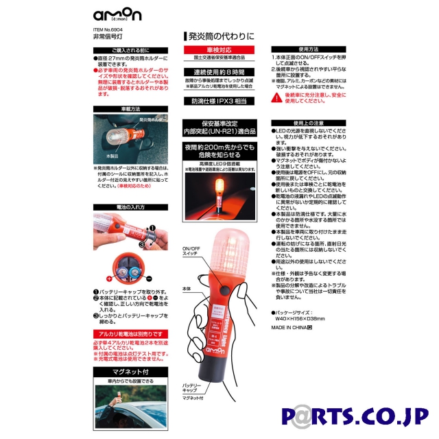 内容物・非常信号灯:1個・動作確認用電池:単4アルカリ乾電池:2本・付属シール:1枚 パッケージサイズ:W40×H156×D38mm 重量:98g