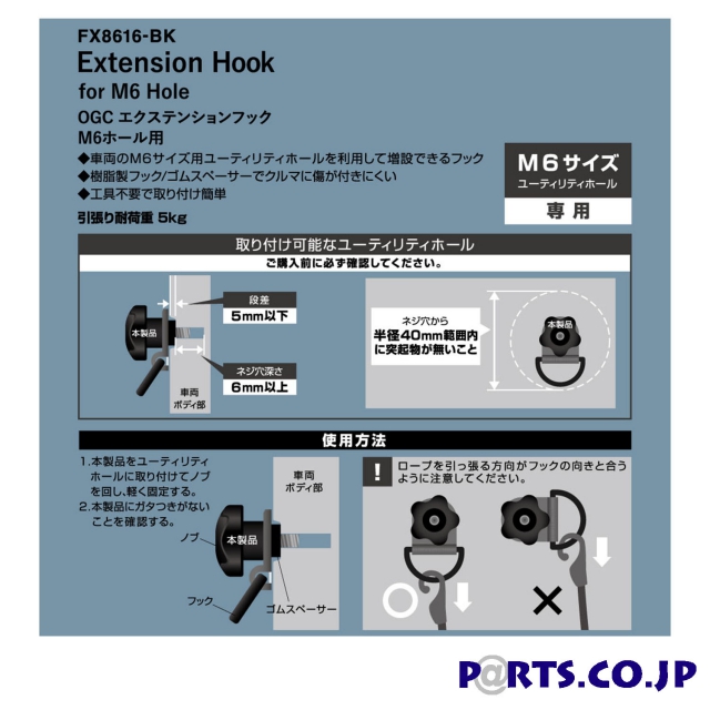 【仕様】適合穴径:M6 (M6サイズ用ユーティリティホール)※車両ボディ部のネジ穴深さ6mm以上適合引張り耐荷重:5kg