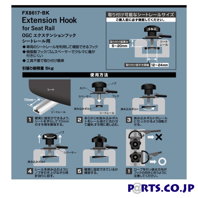 【仕様】適合シートレールサイズ:取り付け部厚み:5-20mm取り付け部すき間幅:12-24mm引張り耐荷重:5kg