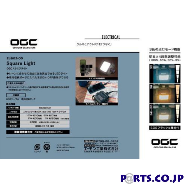 仕様・入力:DC5V 最大2.0A・出力:USB Type-A 5V/2A・使用バッテリー:リチウムイオンバッテリー18650・バッテリー容量:10000mAh 2500mAh×4本・充電時間:約7時間 ※電池の状況により異なります・使用光源:LED色温度 白色5500 6000K 暖色3000 3200K・明るさ:最大1000ルーメン ※当社実測値・本体サイズ:116×120×43mm・使用環境温度範囲:0 40℃・連続点灯時間目安 ※当社実測値 100%:約10時間 60%:約17時間 30%:約35時間 3%:約185時間 SOS:約42時間・防水性能:IPX2相当