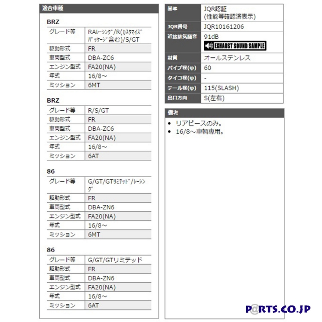■メーカー品番:T713147 ■パイプ径(φ):60 ■タイコ径(φ):- ■テール径(φ):115(SLASH) ■テール(出口):S(左右) ■近接排気騒音値:91dB ■材質:オールステンレス ■JQR認証(JQR10161206)