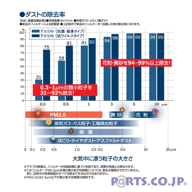 従来の抗菌・脱臭タイプに抗ウイルス機能が追加され、花粉・ほこりだけでなく、微小粒子(PM2.5)の除去にも効果を発揮します。 ■ウイルスをしっかり抑制:植物由来の天然ポリフェノールを採用。フィルターにて捕集されたウイルスの活動を抑制。車内をクリーンに快適に。■菌・カビの繁殖を抑制:高い抗菌効果を発揮する抗菌剤を採用。フィルター表面に付着した菌、カビの繁殖を抑制。クリーンな空気を車内へ供給。■イヤなにおいを強力脱臭:高性能活性炭を採用。排ガス、タバコ、カビ、ペットなどのイヤなにおいを吸着し、高い脱臭効果を発揮。■花粉の侵入をブロック:帯電超極細不織布を採用。通気性を低下させることなく花粉、チリ、ホコリなど0.3μ以上の粉塵をしっかりブロック。