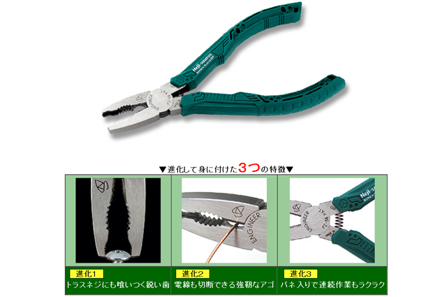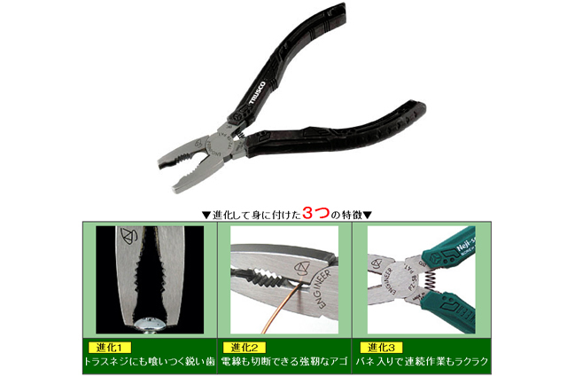 ネジトラブルのレスキューツール超進化系ネジザウルス登場!!新設計の先端形状により頭の低いネジ(トラスネジ)にも対応しました。ネジの噛み角度の調整により、更にネジをしっかりホールドします。刃部を装着しており、ペンチとしてもご使用頂けます。環境にも手にも優しいエラストマーデザイングリップ。