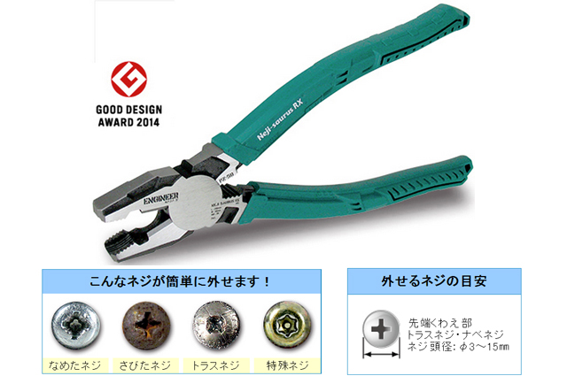 ペンチの常識を覆す、全く新しいネジザウルス登場!!新技術「ギア歯」により、薄い板もしっかり掴みます。T型グリップにより軽量化され、更にねじれにも強くなりました。これまで掴めなかった大きなネジ(M8)にも対応。ネジに食い付く力が従来品と比べて大幅に向上!少ない力でネジを回す事が可能。